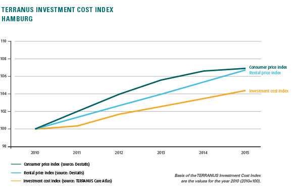 The index thus enables interesting comparisons and conclusions, as the first part of the investment cost index for the city state of Hamburg shows. Investment costs have been steadily rising in Hamburg since 2010, but lag behind the growth in consumer prices. Even more interesting is the comparison to the rental price index: “Since 2012, housing rents in Hamburg have been increasing more than rents for nursing homes; and even quite significantly since 2015,” says Markus Bienentreu. “This means that investors need to calculate rent increases for healthcare properties more conservatively. The TERRANUS Investment Cost Index serves as a reliable blueprint here.”