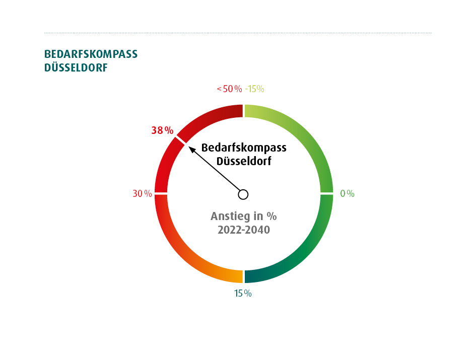 Es besteht großer Handlungsbedarf: Der Düsseldorfer Bedarfskompass steht auf „Rot“. Bis zum Jahr 2040 werden 38 Prozent, also knapp 2.000 zusätzliche Pflegeplätze und damit auch zusätzliche Fachkräfte in der Landeshauptstadt benötigt.