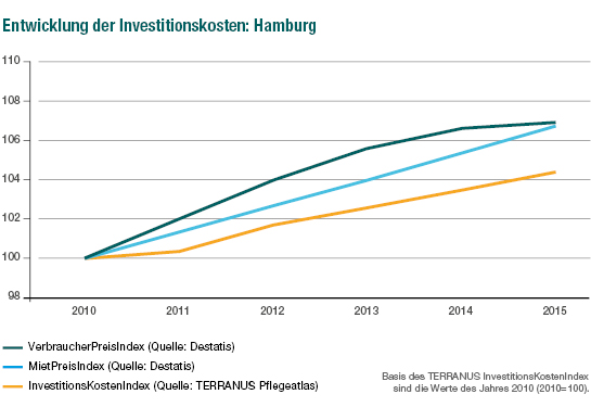 Branchen-Neuheit: Erstmals veröffentlicht TERRANUS einen Investitionskostenindex für Pflegeheime. „Und damit einen exzellenten Indikator für die Entwicklung der Mieten“, erklärt Markus Bienentreu. Der Index startet mit dem Stadtstaat Hamburg, sukzessive folgen die anderen Bundesländer.